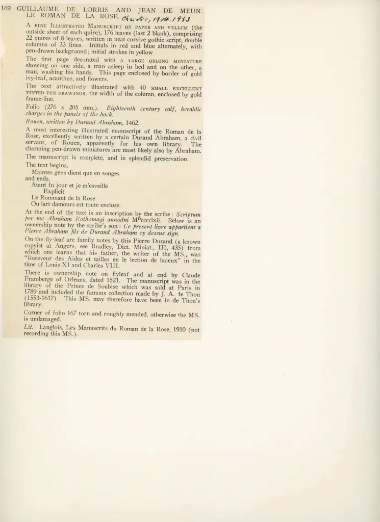 Ritaglio da Christie's Since the War, 1945-1958: An Essay on Taste, Patronage and Collecting, lot 169, Guillaume de Lorris and Jean de Meun. Le Roman de la Rose. La pagina miniata si trova all'inizio del capitolo I del Roman de la Rose: la scena rappresenta il protagonista addormentato nel suo letto e il capolettera è l'iniziale M(aintes) gens dient que en songes