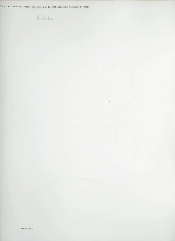 Si tratta della riproduzione fotomeccanica del foglio 3v del Guiron le Courtois di Bernabò Visconti (Paris, BnF, Nouvelles Acquisitiones Françaises 5243) pubblicata in Arte lombarda dai Visconti agli Sforza (Milano, Palazzo Reale, Aprile-Giugno 1958), Milano 1958, p. 28 e tav. XLV. Il manoscritto integralmente digitalizzato a colori è visibile all'indirizzo https://archivesetmanuscrits.bnf.fr/ark:/12148/cc408321 (data ultima consultazione: 14/12/2023).