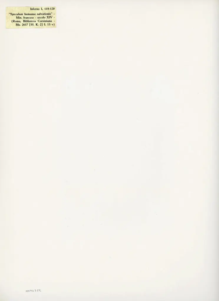 Si tratta della riproduzione fotomeccanica a colori del foglio 13v del manoscritto 2167 [55.K.2 (Rossi 17)] della Biblioteca Corsiniana di Roma (Speculum humanae salvationis). Il manoscritto fu esposto alla Mostra storica nazionale della Miniatura del 1953, cfr. il catalogo a cura di G. Muzzioli, Roma 1953, n. 450, con rinvio a P. D'Ancona, Un'opera ignorata di Attavante degli Attavanti alla Biblioteca Corsiniana di Roma, in «Rivista d'Arte», n. 5-6 (1910), pp. 113-123: 113, nt. 1.