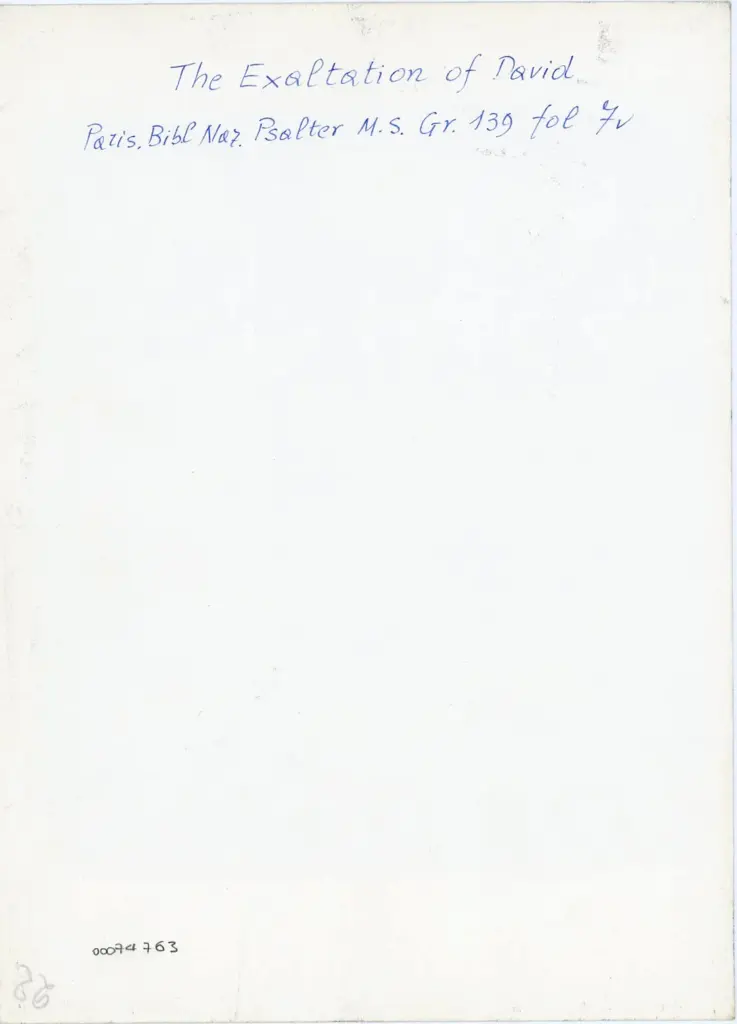 Si tratta della fotografia della riproduzione fotomeccanica del foglio 7v del manoscritto Grec 139 della Bibliothèque nationale de France di Parigi (noto come Salterio di Parigi) pubblicata in Buchthal Hugo, The Miniatures of the Paris Psalter. A study in Middle Byzantine Painting, London, The Warburg Institute, 1938, 2 voll. Il manoscritto integralmente digitalizzato a colori è visibile all'indirizzo https://gallica.bnf.fr/ark:/12148/btv1b10515446x/. Si veda anche la scheda dedicata al codice nel portale Biblissima all'indirizzo https://portail.biblissima.fr/ark:/43093/mdatac13a83a0cf42b3f1f0744cc4fad20c9822beed5e . I siti sono stati consultati in data 09/01/2024.