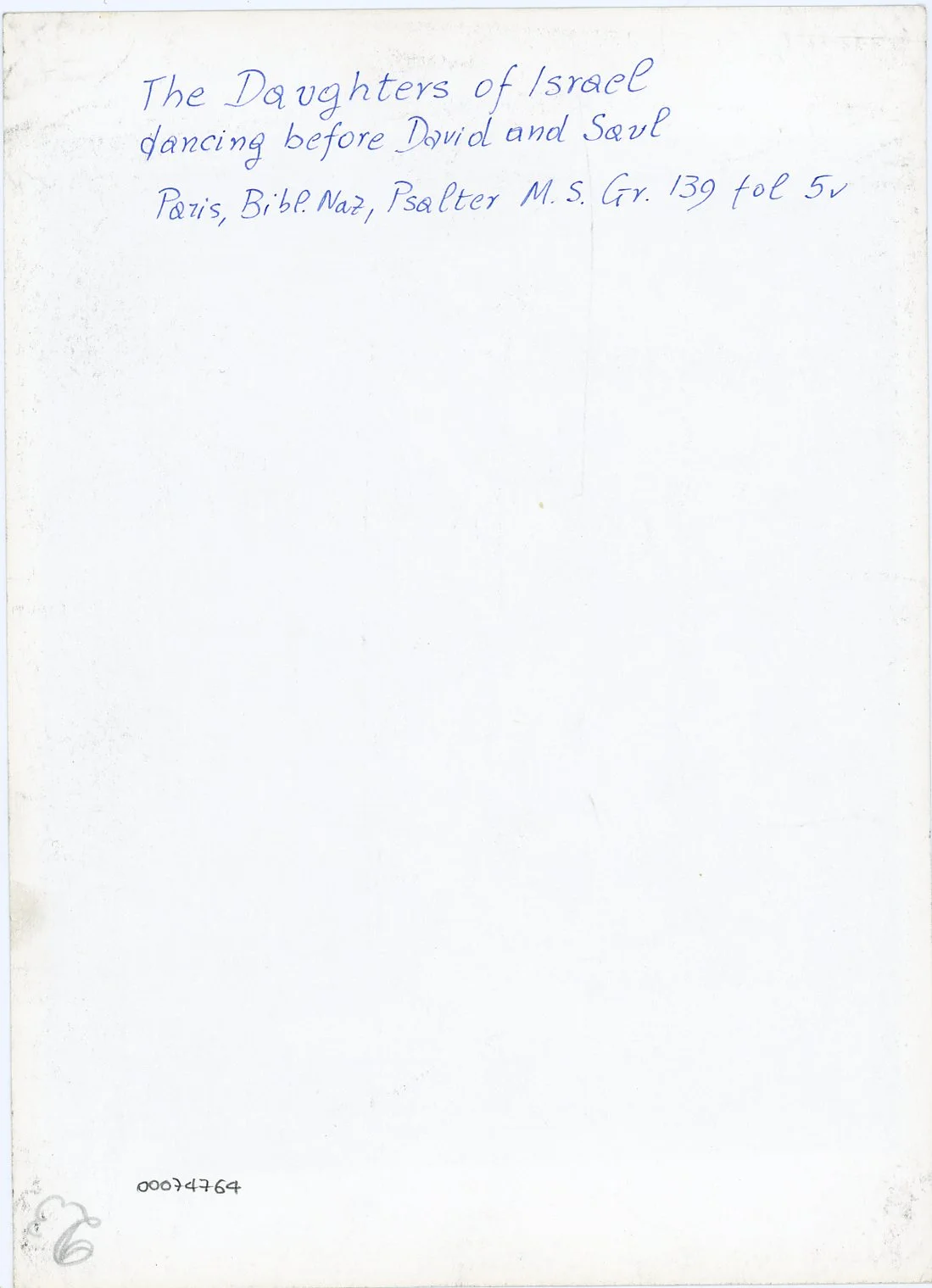 Si tratta della fotografia della riproduzione fotomeccanica del foglio 5v del manoscritto Grec 139 della Bibliothèque nationale de France di Parigi (noto come Salterio di Parigi) pubblicata in Buchthal Hugo, The Miniatures of the Paris Psalter. A study in Middle Byzantine Painting, London, The Warburg Institute, 1938, 2 voll. Il manoscritto integralmente digitalizzato a colori è visibile all'indirizzo https://gallica.bnf.fr/ark:/12148/btv1b10515446x/. Si veda anche la scheda dedicata al codice nel portale Biblissima all'indirizzo https://portail.biblissima.fr/ark:/43093/mdatac13a83a0cf42b3f1f0744cc4fad20c9822beed5e . I siti sono stati consultati in data 09/01/2024.