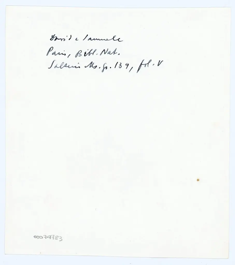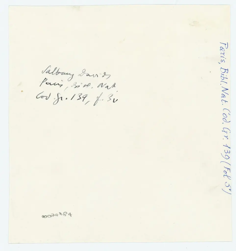 Si tratta di due fotografia della riproduzione fotomeccanica del foglio 3v (erroneamente indicato come foglio V) del manoscritto Grec 139 della Bibliothèque nationale de France di Parigi (noto come Salterio di Parigi). Cfr. Buchthal Hugo, The Miniatures of the Paris Psalter. A study in Middle Byzantine Painting, London, The Warburg Institute, 1938, 2 voll. Il manoscritto integralmente digitalizzato a colori è visibile all'indirizzo https://gallica.bnf.fr/ark:/12148/btv1b10515446x/. Si veda anche la scheda dedicata al codice nel portale Biblissima all'indirizzo https://portail.biblissima.fr/ark:/43093/mdatac13a83a0cf42b3f1f0744cc4fad20c9822beed5e . I siti sono stati consultati in data 15/01/2024.