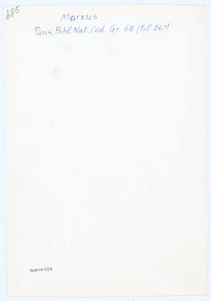 Si tratta della fotografia della riproduzione fotomeccanica del foglio 56v del manoscritto Grec 68 della Bibliothèque nationale de France pubblicata in Weitzmann Kurt, Die byzantinische Buchmalerei des 9. und 10. Jahrhunderts, Berlin, 1935, tav. LXXIX, fig. 485. Il manoscritto integralmente digitalizzato è visibile all'indirizzo https://gallica.bnf.fr/ark:/12148/btv1b107236674. Si veda anche la scheda dedicata al codice nel portale Biblissima all'indirizzo https://portail.biblissima.fr/fr/ark:/43093/mdataeab51ccdf567d509277af1bdb90a43a010592c2c. I siti sono stati consultati in data 16/01/2024.