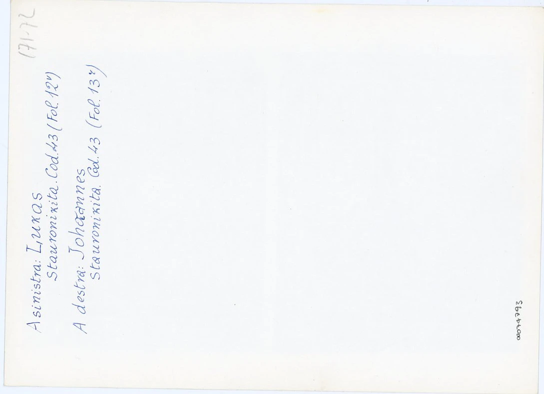Si tratta della fotografia della riproduzione fotomeccanica dei fogli 12v e 13r del manoscritto 43 del Monastero di Stavronikita sul Monte Athos pubblicata in Weitzmann Kurt, Die byzantinische Buchmalerei des 9. und 10. Jahrhunderts mit 94 Abbildungen im Text und 93 Lichtdrucktafeln, Berlin, Mann, 1935, tav. XXX, figg. 171-172.