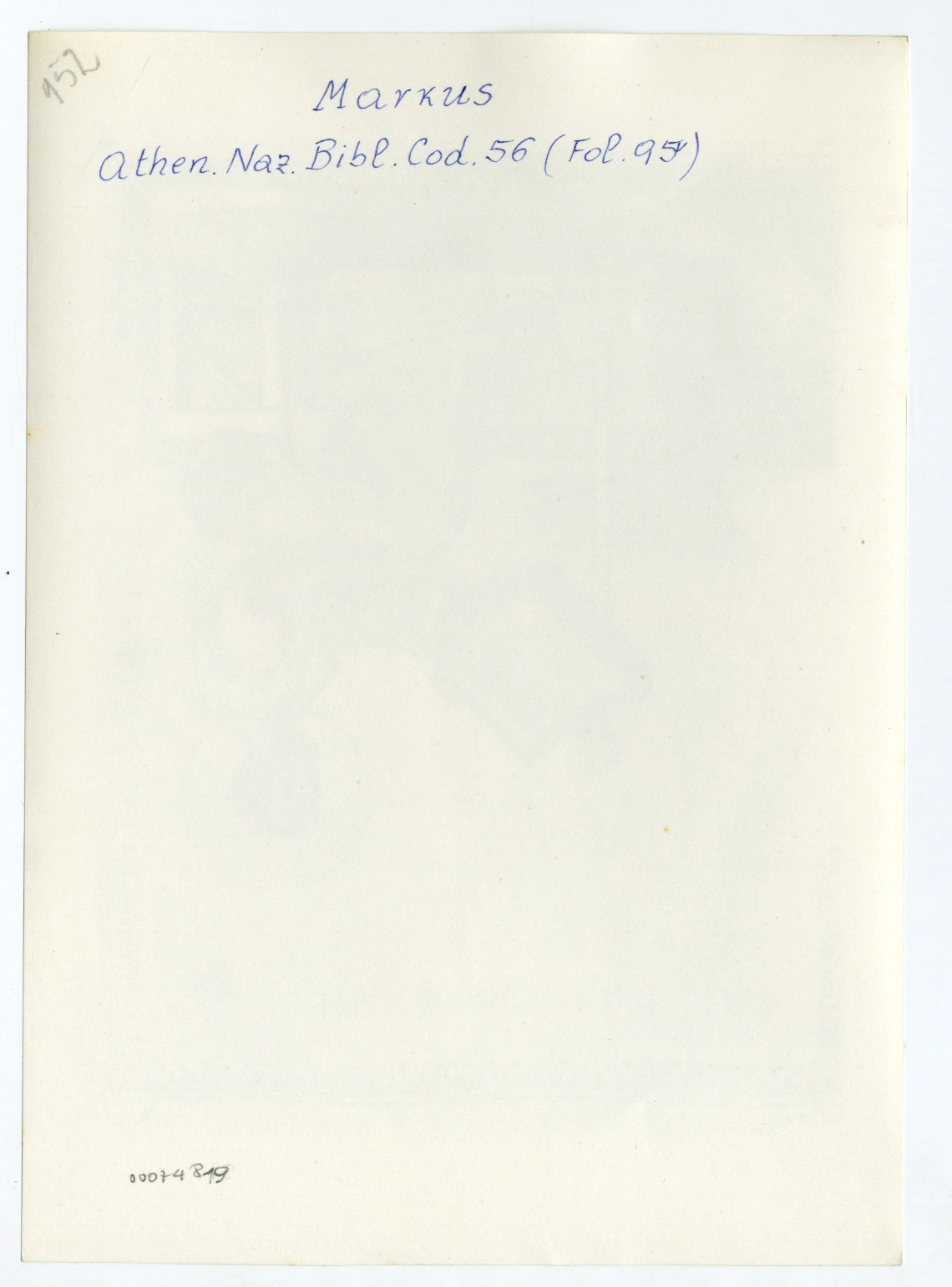 Si tratta della fotografia della riproduzione fotomeccanica del foglio 95v del manoscritto NLG 56 della National Library of Greece di Atene pubblicata in Weitzmann Kurt, Die byzantinische Buchmalerei des 9. und 10. Jahrhunderts mit 94 Abbildungen im Text und 93 Lichtdrucktafeln, Berlin, Mann, 1935, tav. XXVII, fig. 152. Il manoscritto integralmente digitalizzato a colori è visibile all'indirizzo https://manuscripts.csntm.org/manuscript/View/GA_773 (data ultima consultazione: 22/01/2024).