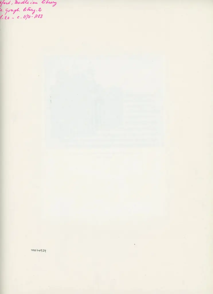 Si tratta della riproduzione fotomeccanica del foglio 20r del manoscritto Gough Liturg. 2 della Bodleian Library di Oxford. Il manoscritto digitalizzato a colori è visibile all'indirizzo https://digital.bodleian.ox.ac.uk/objects/50a477af-307d-421c-9911-a7b708389cb4/ (data ultima consultazione: 05/03/2024).