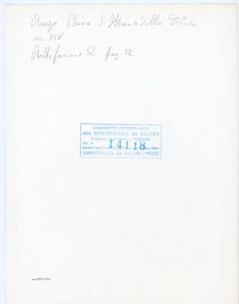 • Gabinetto Fotografico della Soprintendenza Speciale per il Patrimonio Storico, Artistico ed Etnoantropologico e per il Polo Museale della città di Firenze , Arezzo. Chiesa S. Maria della Pieve - sec. XIV - Antifonario D pag. 32 , retro