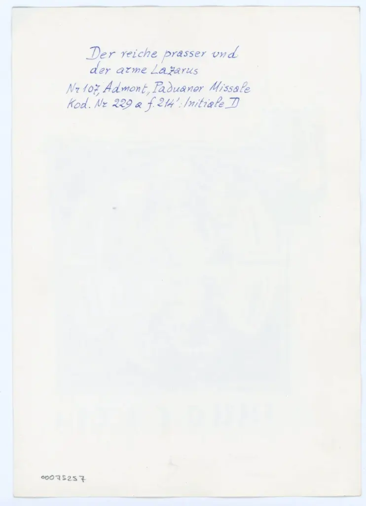 Si tratta della fotografia della riproduzione fotomeccanica dell'iniziale D del foglio 214v del manoscritto LA222 della Fundaçao Calouste Gulbenkian di Lisbona (olim Admont, Benediktinerstift, Cod. 229 a), pubblicata in Paul Buberl, Die illuminierten Handschriften in der Steiermark, vol. I, Die Stiftsbibliotheken zu Admont und Vorau, Leipzig, Hiersemann 1911 (Beschreibendes Verzeichnis der illuminierten Handschriften in Österreich, 4,1), cat. 107, tav. XX, fig. 2.Il manoscritto è stato venduto a Parigi nel 1936 per 80.000 scellini, cfr. la scheda del manoscritto sul sito "manuscripta.at - Mittelalterliche Handschriften in Österreich" all'indirizzo https://manuscripta.at/?ID=26091(data ultima consultazione: 10/09/2024).
