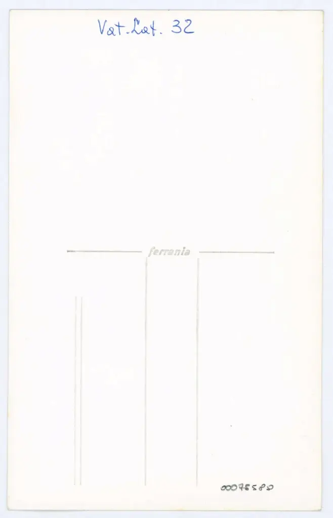 Si tratta della fotografia di un particolare del foglio 158r del manoscritto Vat. lat. 39 della Biblioteca Apostolica Vaticana, erroneamente indicato come Vat. lat. 32 nell'annotazione manoscritta sul verso. Il manoscritto interamente digitalizzato a colori è visibile all'indirizzo https://digi.vatlib.it/view/MSS_Vat.lat.39 (data ultima consultazione: 12/06/2025).