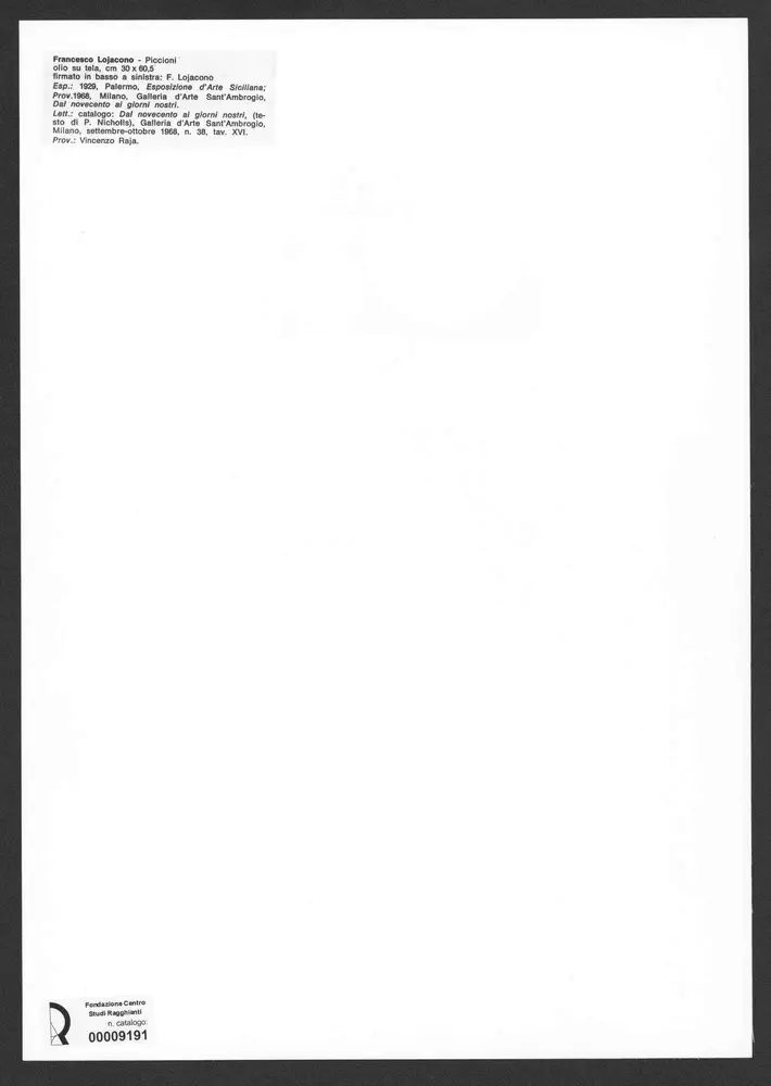Francesco Lojacono - Piccioni olio su tela, cm 30x60,5 firmato in basso a sinistra: F.Lojacono Esp.:1929, Palermo Esposizione d'Arte Siciliana; Prov.1968, Milano Galleria d'Arte Sant'Ambrogio, Dal novecento ai giorni nostri. Lett.: catalogo: Dal novecento ai giorni nostri, (testo di P.Nicholis), Galleria d'Arte Sant'Ambrogio, Milano, settembre-ottobre 1968, n.38, tav.XVI. Prov.:Vincenzo Raja.