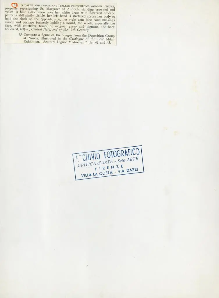 131 A large and important italian polychrome wooden figure; propably representing St. Margaret of Antioch, standing crowned and veiled, a blue cloak worn over her white dress [vedi annotazioni]