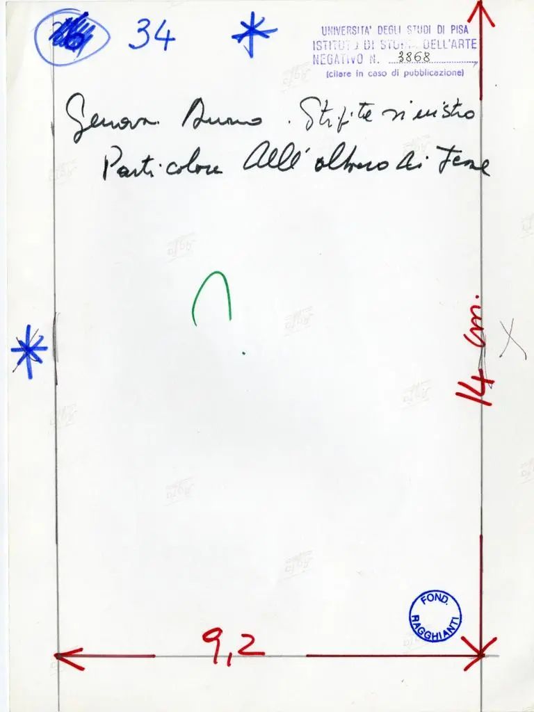 Il numero di negativo è compreso nel range riferibile alla campagna denominata Genova, Duomo (S. Lorenzo) - Architettura e scultura <Soldani>, immediatamente precedente a quella del 1967 dedicata a Lucca, Diocesi (Monti Pisani), chiese medioevali - Architettura e scultura, realizzata per la tesi di laurea di Flora La Selva, e (fonte dati: Archivio del laboratorio Fotografico del Dipartimento di Civiltà e Forme del sapere, già Istituto di Storia dell'Arte dell'Università di Pisa). C.L. Ragghianti abbandona definitivamente l'Università di Pisa nel 1972-74 (già nel 1969 aveva fondato l'UIA, istituto privato con sede a Firenze e Venezia).