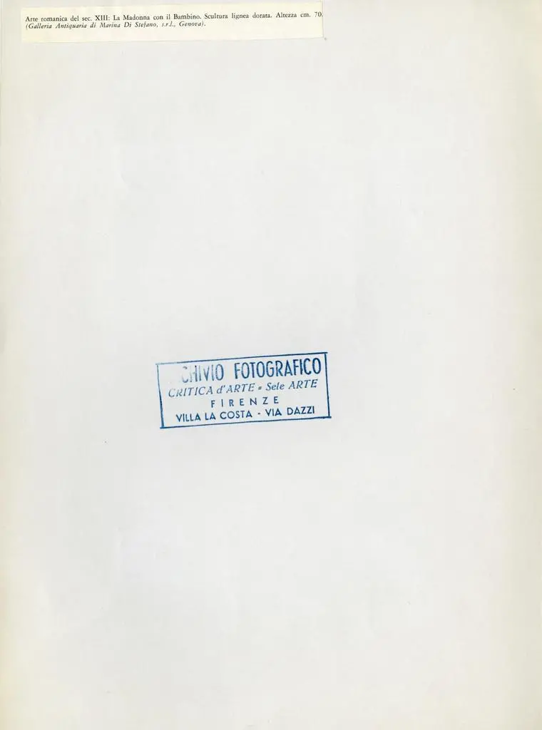 Anonimo , Arte romanica del sec. XIII: La Madonna con il Bambino. Scultura lignea dorata. Altezza cm. 70. (Galleria Antiquaria di Marina Di Stefano)