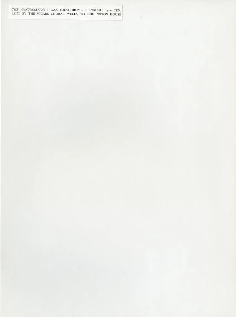 The Annunciation: oak polychrome: English, 14th cen. Lent by the vicars choral, Wells, to Burlington House