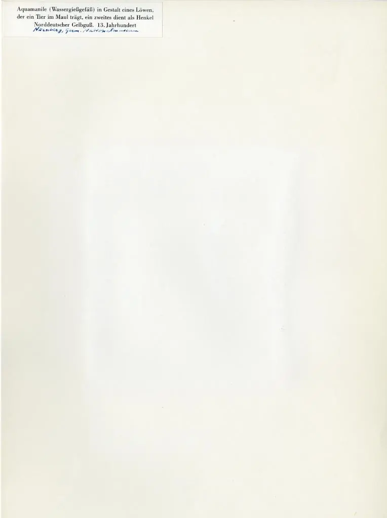 Aquamanile (Wassergießgefäß) in Gestalt eines Löwen, der ein Tier im Maul trägt, ein zweites dient als Henkel Norddeutscher Gelbguß. 13. Jahrhundert - Nürnberg, Germanische Nationalmuseum