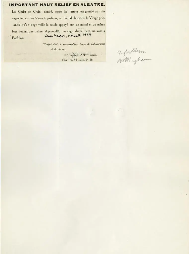 Important Haut Relief en albatre. Le Christ en Croix, nimbé, entre les larrons est glorifié par des anges tenant des Vases à parfums, au pied de la croix, la Vierge prie, tandis qu'un ange veille..
