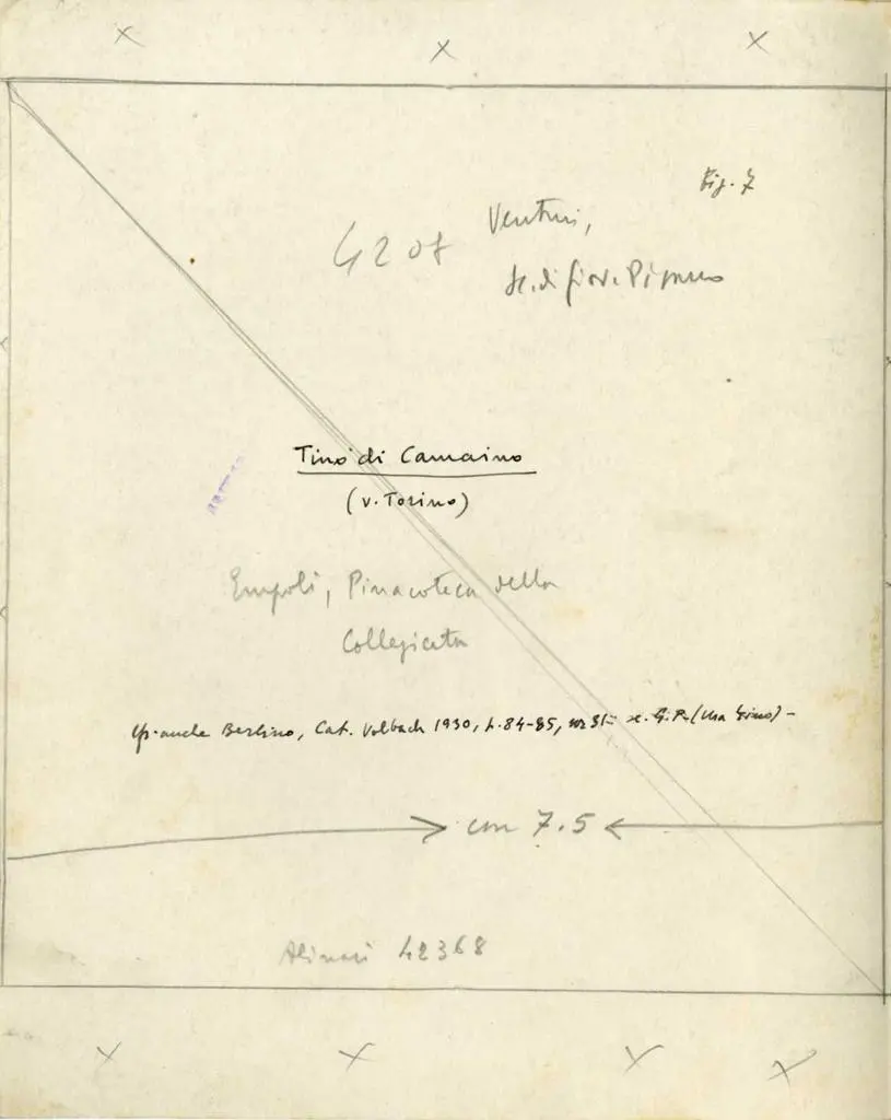 Venturi/ Sc. di Giov. Pisano/ Tino di Camaino/ (v. Torino)/ Empoli, Pinacoteca della/ Collegiata/ cfr. anche Berlino, cat. Volbach 1930, p. 84-85, nr 31: sc G. P. (ma Tino)