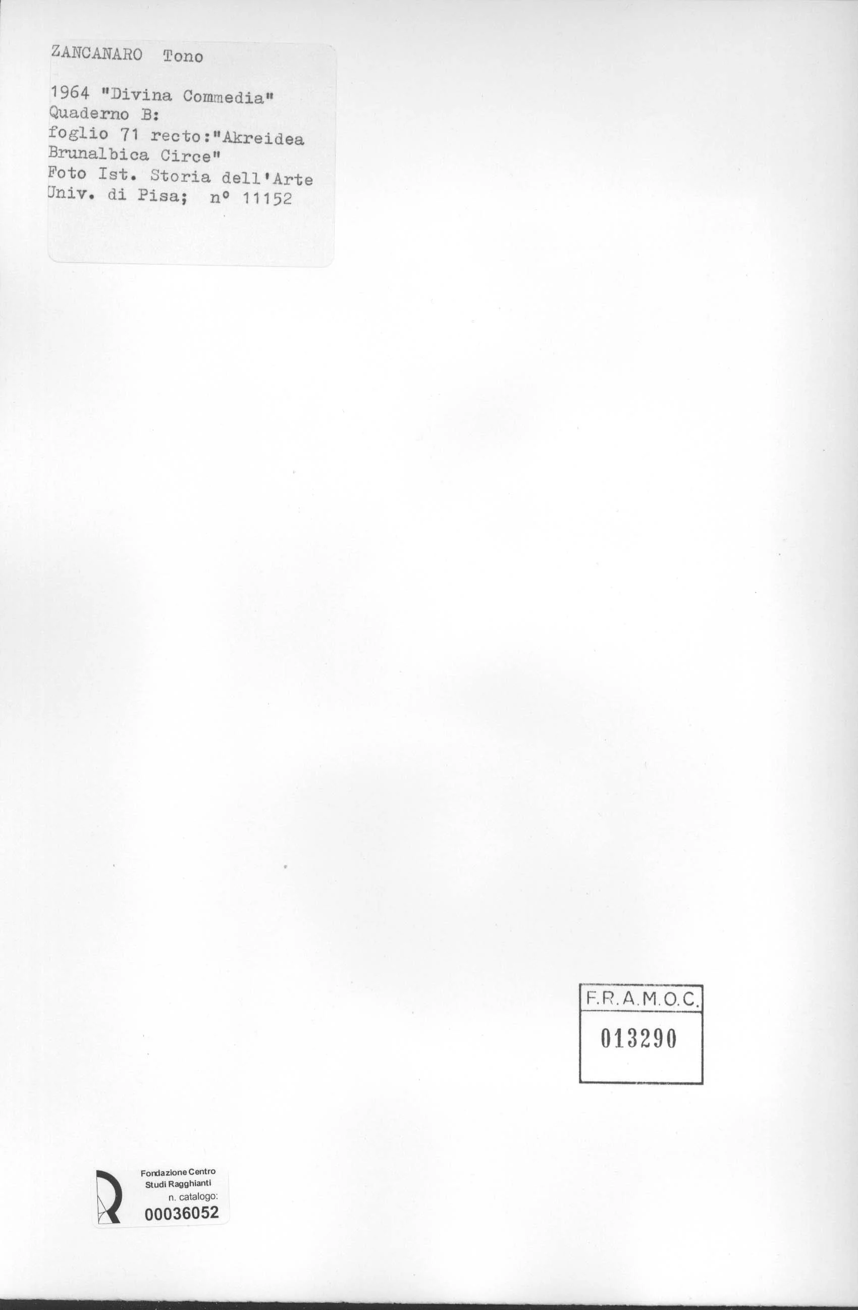 Università di Pisa. Dipartimento di Storia delle Arti , Zancanaro, Antonio - sec. XX - Divina Commedia: quaderno B, foglio 71 recto: "Akreidea Brunalbica Circe"
