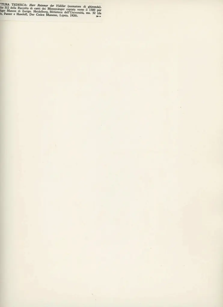 Riproduzione fotomeccanica del foglio 312r del Cod. Pal. germ. 848 dell'Universitätsbibliothek di Heidelberg, pubblicata in Hooreman Paul, Musici nel tempo, Istituto Geografico de Agostini, Novara 1952, p. 16.