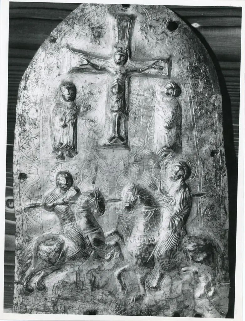 La lastra di rame dorato in oggetto raffigura lo scontro armato tra il vescovo Adelpreto e Aldrighetto di Castelbarco.