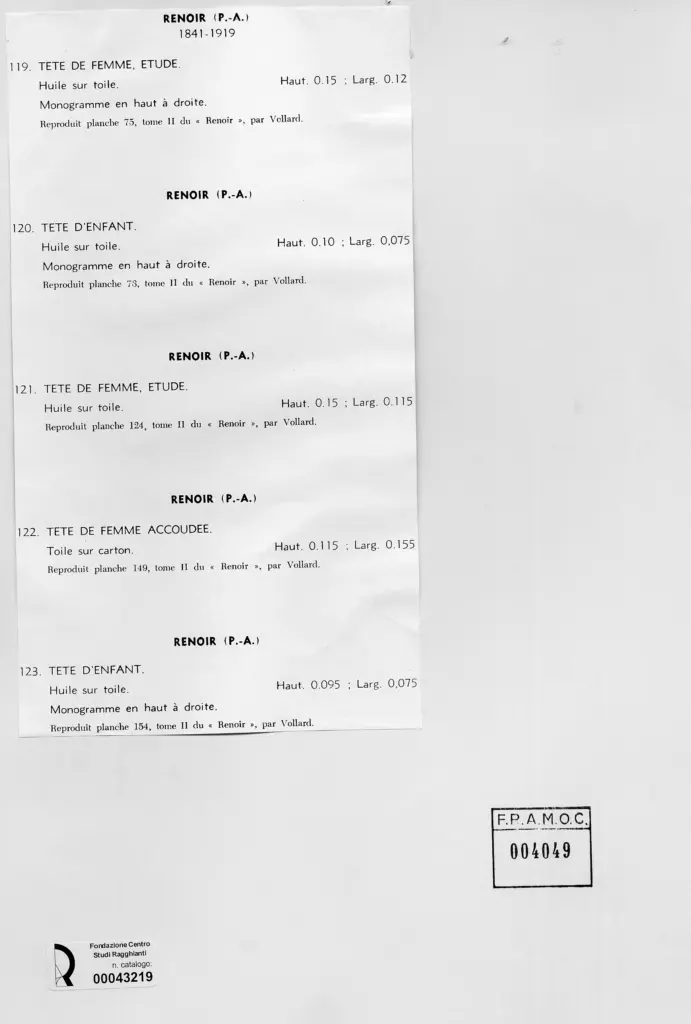 Renoir, Pierre Auguste, Studio di testa di donna, Testa di bambino, Testa di donna chianata