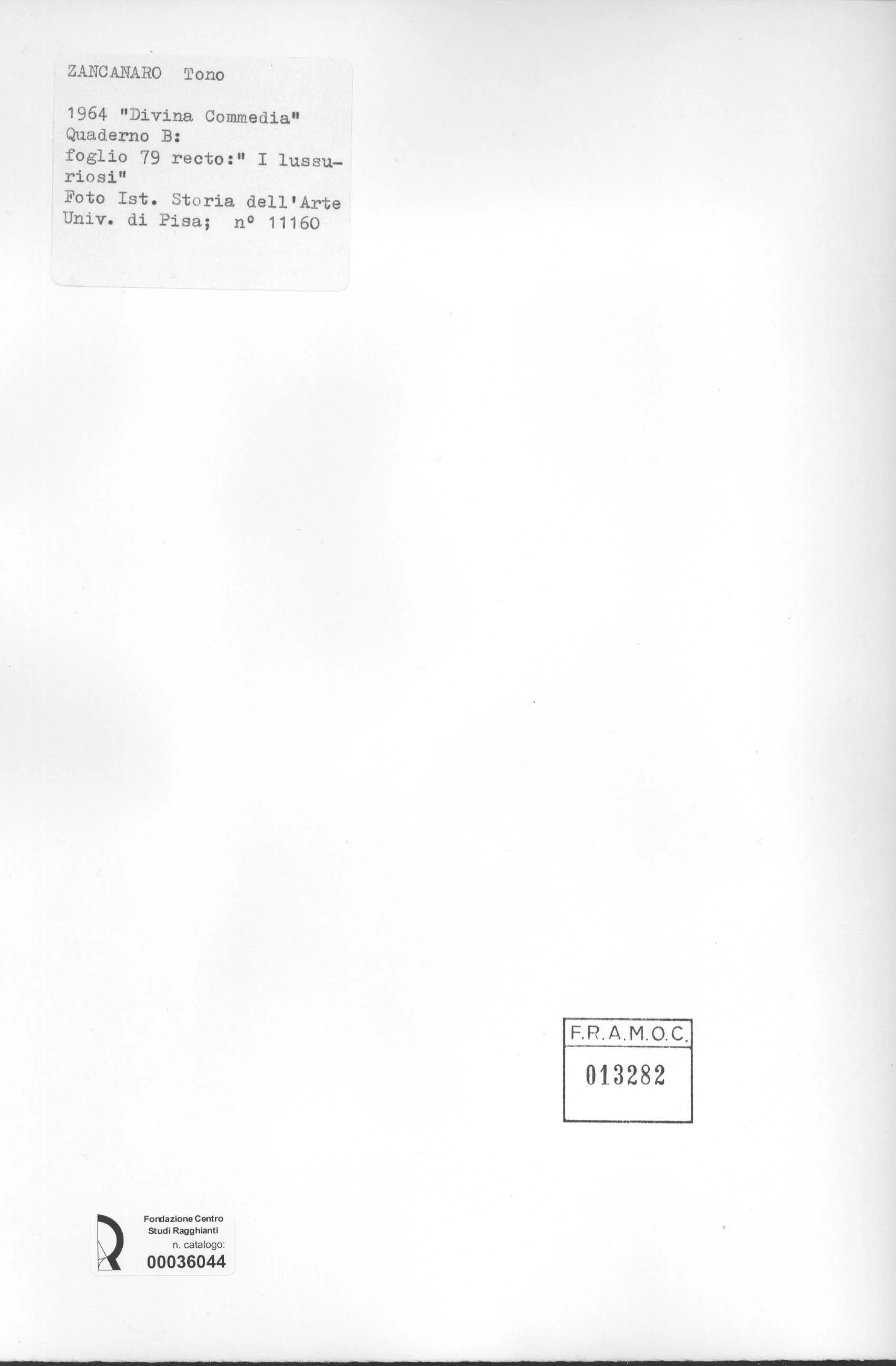 Anonimo , Zancanaro, Antonio - sec. XX - "Divina Commedia": quaderno B, foglio 79 recto: "I lussuriosi" , retro