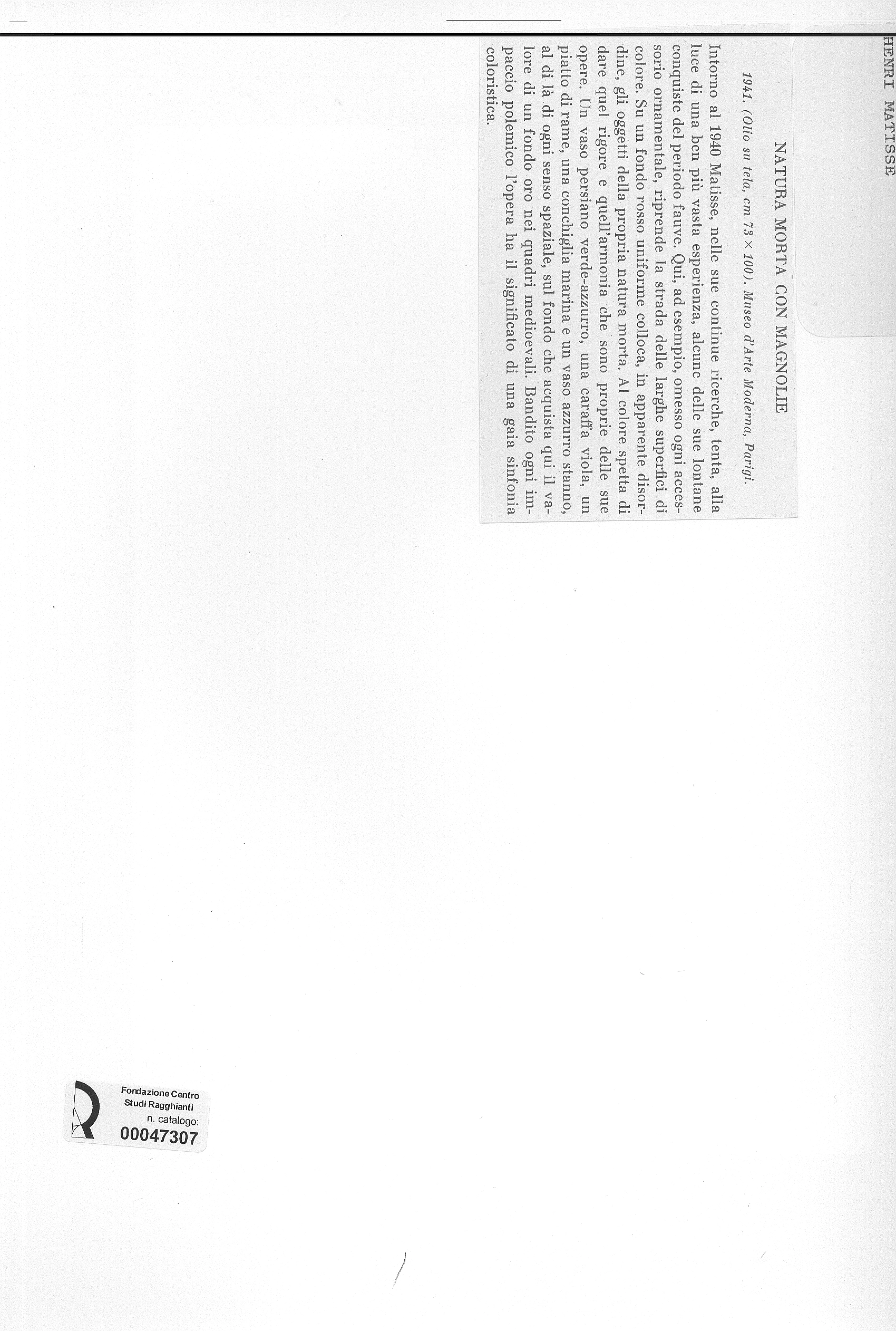 • Anonimo , Matisse, Henri - sec. XX - Natura morta con magnolie , fronte