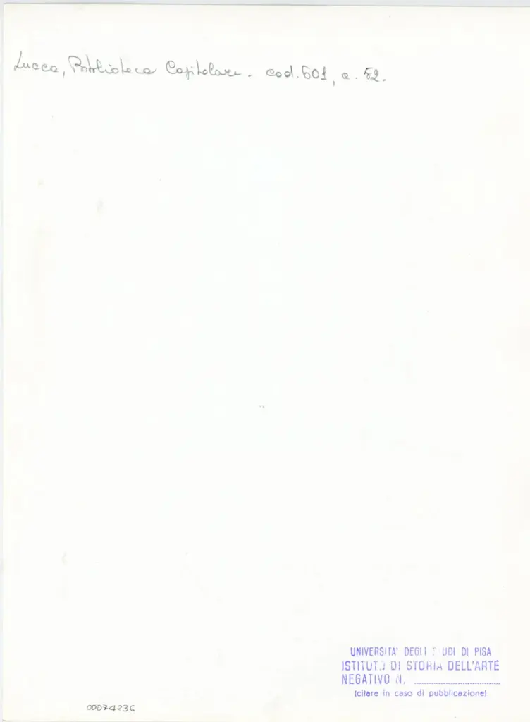 • Università di Pisa. Dipartimento di Storia delle Arti , Anonimo italiano - sec. XII, metà - Lucca, Biblioteca Capitolare Feliniana, Ms. 601, f. 52r, particolare , retro