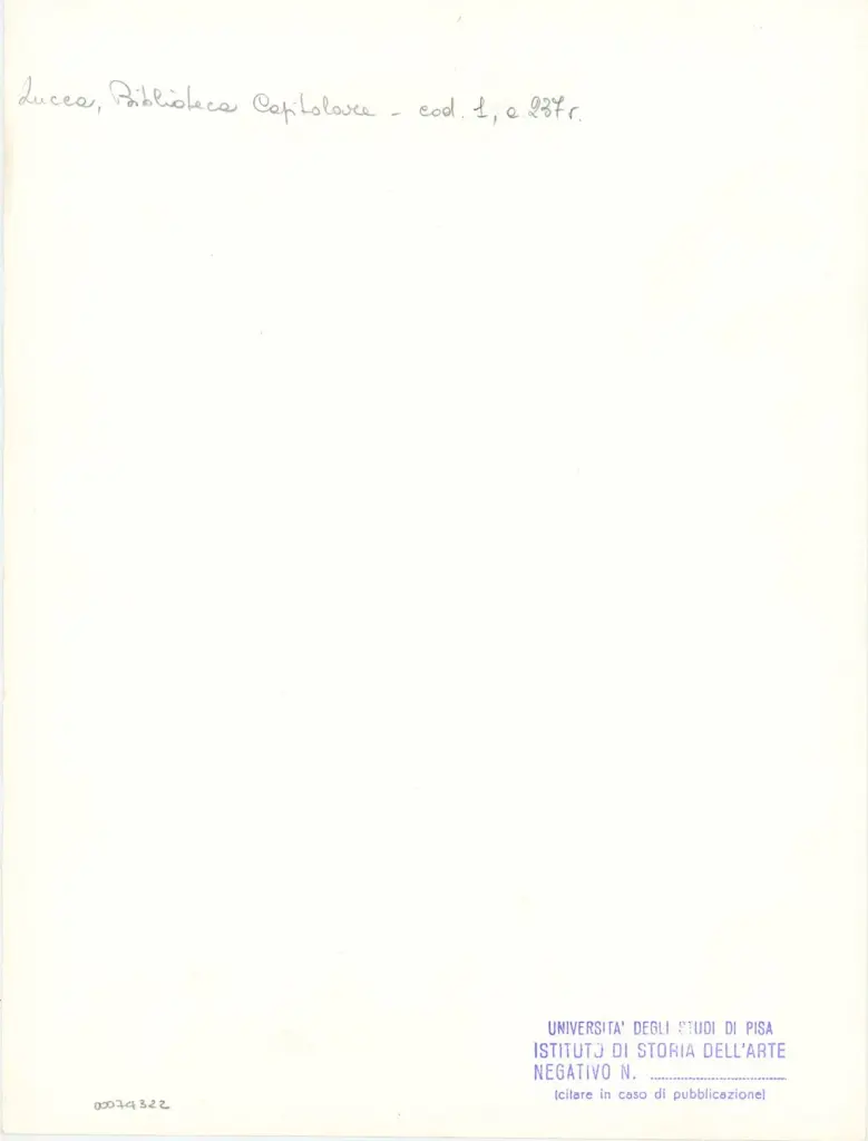 Ulteriore bibliografia specifica: Violi L., La Bibbia 1 della Biblioteca Capitolare Feliniana di Lucca: testo, immagini, autografia, in Rivista di storia della miniatura, 21, 2017, pp. 5 (Tav. I), 27-38