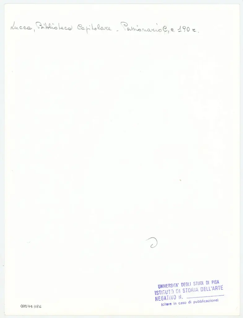 • Università di Pisa. Dipartimento di Storia delle Arti , Anonimo italiano - sec. XI, ultimo quarto - Lucca, Biblioteca Capitolare Feliniana, Ms. Passionario C, f. 176r, particolare , retro
