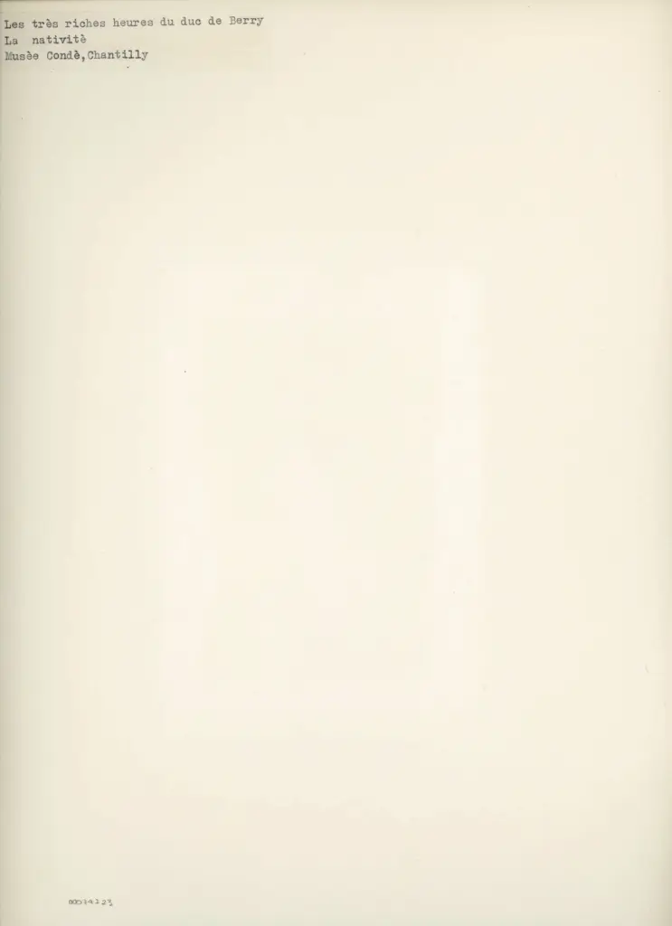 Si tratta della riproduzione fotomeccanica a colori del foglio 44v del manoscritto 65 oggi conservato al Musée Condé di Chantilly (Les Très Riches Heures du duc de Berry, libro d'Ore commissionato dal duca Jean Ier de Berry) con l'iniziale D(eus), in adiutorium meum intende. Il manoscritto integralmente digitalizzato a colori è visibile all'indirizzo https://portail.biblissima.fr/ark:/43093/mdata2ed44cf11cd47fa1dcf490d50af276190b628900 (data ultima consultazione: 19/12/2023).