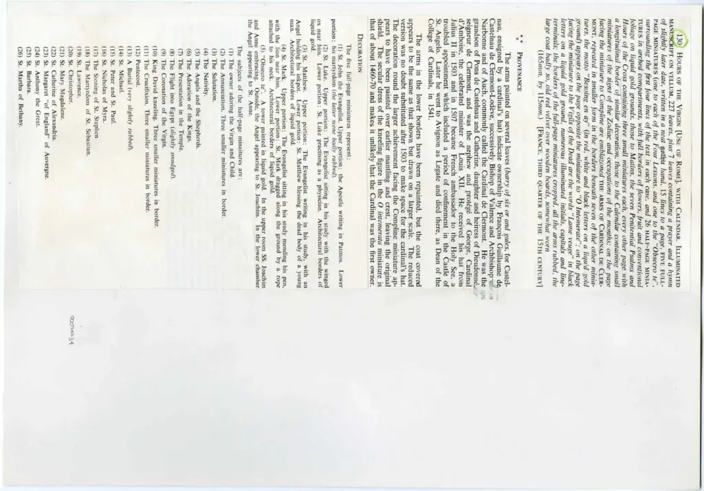 Si tratta della riproduzione fotomeccanica di un foglio di un Libro d'Ore della Vergine con Calendario all'uso di Roma. La miniatura introduce la preghiera O(bsecro) te, Domina Sancta Maria, Mater Dei, pietate plenissima.