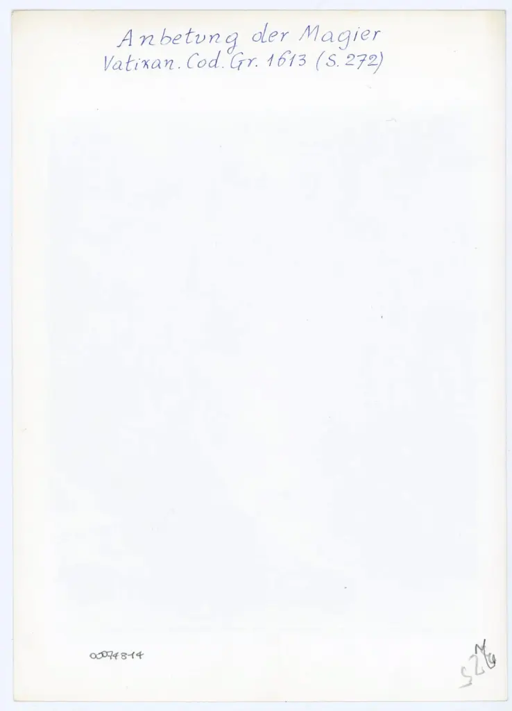 Si tratta della fotografia della riproduzione fotomeccanica del foglio 272 del manoscritto Vaticano Greco 1613 della Biblioteca Apostolica Vaticana (Menologio di Basilio II) pubblicata in Weitzmann Kurt, Die byzantinische Buchmalerei des 9. und 10. Jahrhunderts mit 94 Abbildungen im Text und 93 Lichtdrucktafeln, Berlin, Mann, 1935, tav. XL, fig. 225. Il manoscritto integralmente digitalizzato a colori è visibile all'indirizzo https://digi.vatlib.it/view/MSS_Vat.gr.1613 (data ultima consultazione: 18/01/2024).