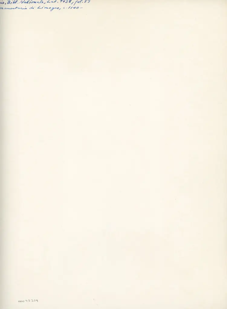 Si tratta della riproduzione fotomeccanica del foglio 59r del manoscritto del manoscritto Larin 9438 della Bibliothèque nationale de France di Parigi (noto come Sacramentario di Limoges). Il manoscritto interamente digitalizzato a colori è visibile all'indirizzo https://archivesetmanuscrits.bnf.fr/ark:/12148/cc77463g (data ultima consultazione: 12/11/2024).