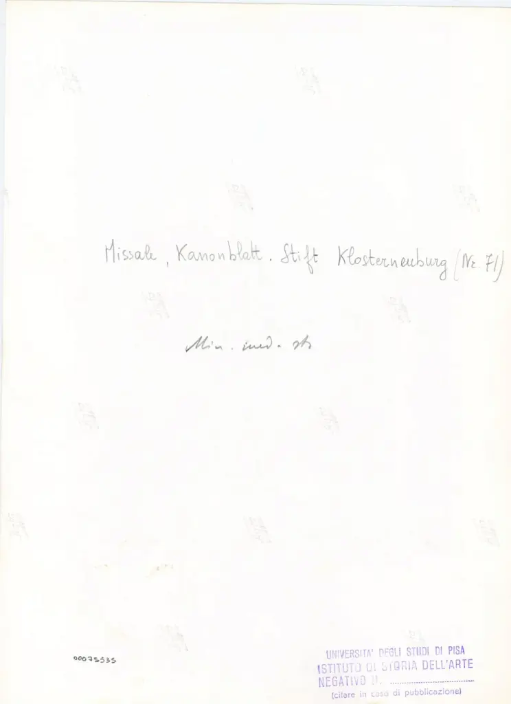 Si tratta della fotografia della riproduzione fotomeccanica del foglio 113v del codice 71 dell'Augustiner-Chorherrenstift di Klosterneuburg (Missale Claustroneoburgense) pubblicata in Tietze H., Österreichische Buchmalerei der Gotik, in Die graphischen Künste, vol. 51 (1928), pp. 1-14: p. 3, Abb. 3. Si vedano la scheda e la riproduzione digitale a colori all'indirizzo https://manuscripta.at/hs_detail.php?ID=917(data ultima consultazione: 21/01/2025).