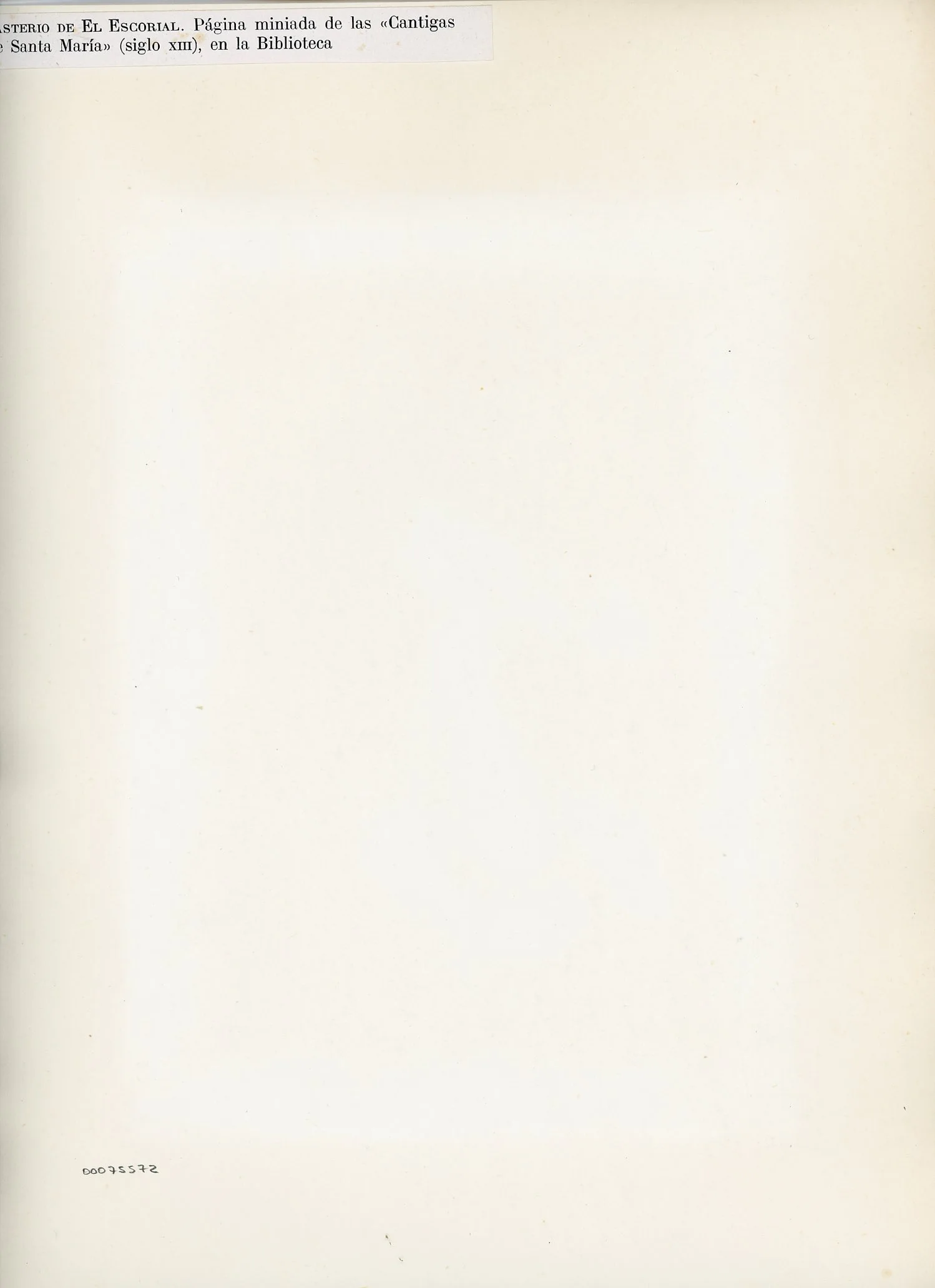 Si tratta della riproduzione fotomeccanica di un foglio del manoscritto T.j.2 ("E2") del Monastero de l'Escorial, noto anche come Codice Rico che raccoglie le Cantigas de Santa Maria. Il manoscritto interamente digitalizzato a colori è visibile all'indirizzo https://www.patrimonionacional.es/colecciones-reales/cantigas-de-santa-maria-codice-rico (data ultima consultazione: 04/02/2025).