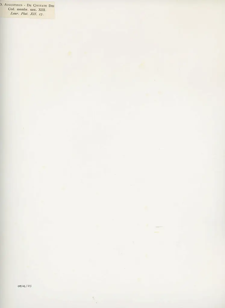 Si tratta della riproduzione fotomeccanica del foglio 2v del manoscritto Plut.XII.17 (Sant'Agostino, De civitate Dei) della Biblioteca Medicea Laurenziana di Firenze pubblicata in Riproduzioni di manoscritti miniati: cinquanta tavole in fototipia da codici della R. Biblioteca Medicea Laurenziana, a cura di G. Biagi, Libreria antiquaria T. de Marinis, Firenze 1914, tav. XII. Il manoscritto integralmente digitalizzato a colori è visibile all'indirizzo https://tecabml.contentdm.oclc.org/digital/collection/plutei/id/104461/rec/1 (data ultima consultazione: 04/11/2024).