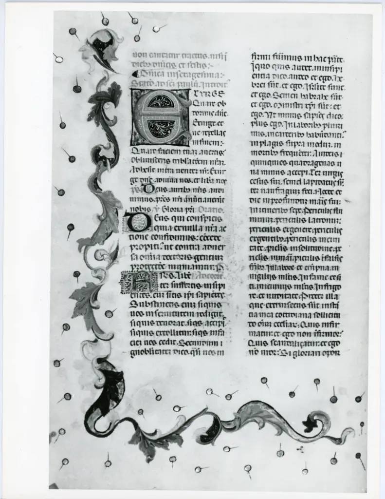 Pagina miniata, Fregio con motivi vegetali, Iniziale O, Iniziale decorata