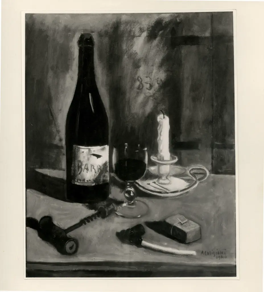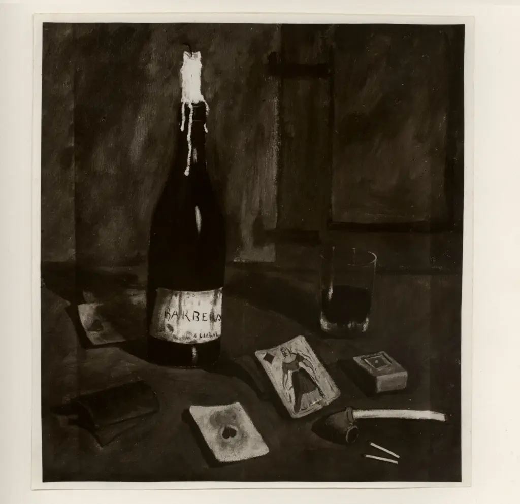 Caligiani, Alberto , Natura morta con Barbera, carte da gioco e pipa Caligiani, Alberto