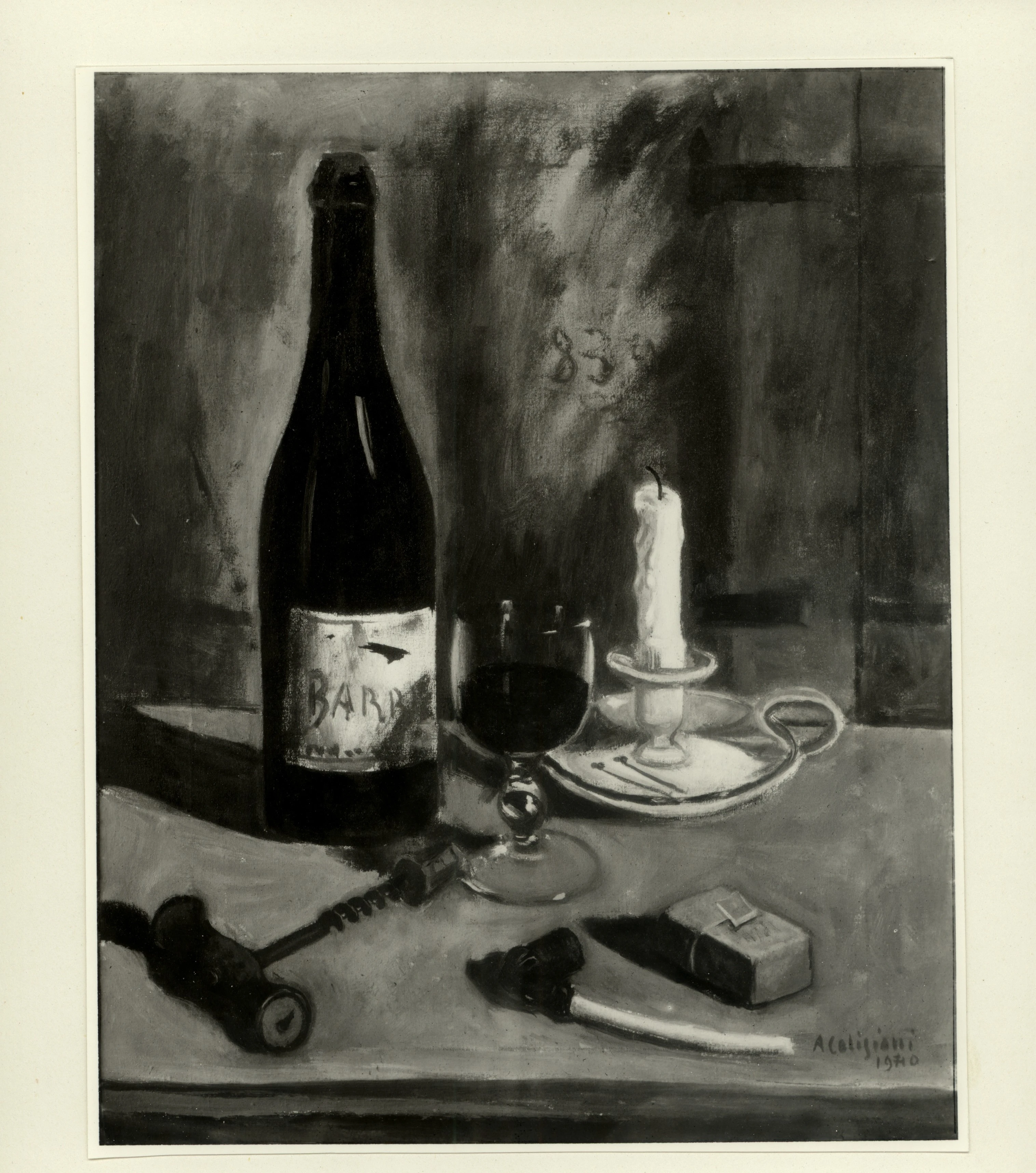 ![Caligiani, Alberto , Natura morta con Barbera, carte da gioco e pipa]()