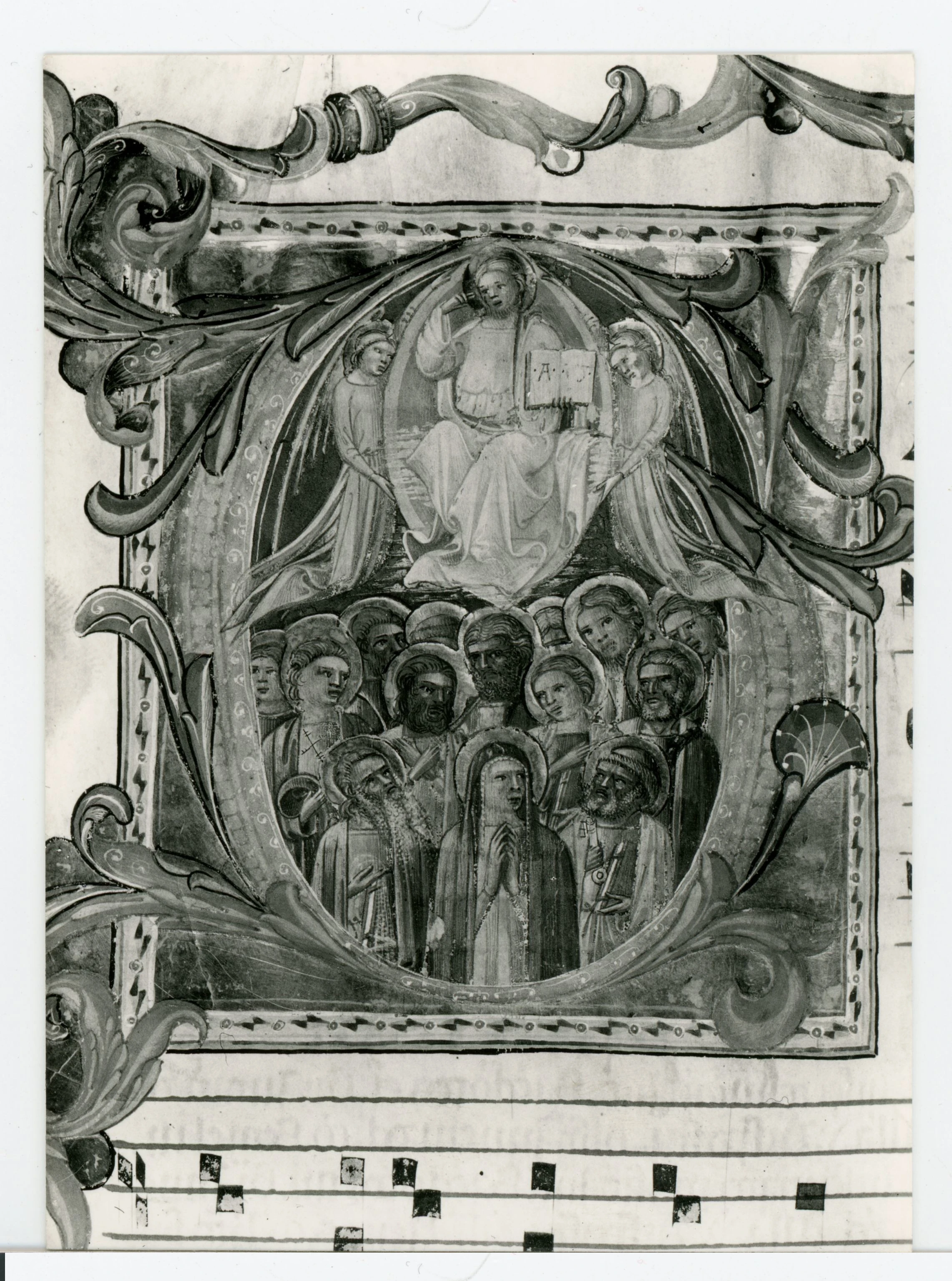 Iniziale G, Iniziale abitata, Ognissanti, San Pietro, San Giovanni Evangelista, Maria Vergine, Motivi decorativi fitomorfi, Notazione musicale