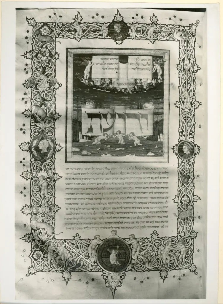 ![ , Pagina miniata, Cornice con motivi decorativi fitomorfi e animali, Putti, Ritratto a mezzo busto di donna di profilo, Ritratto maschile di profilo]()