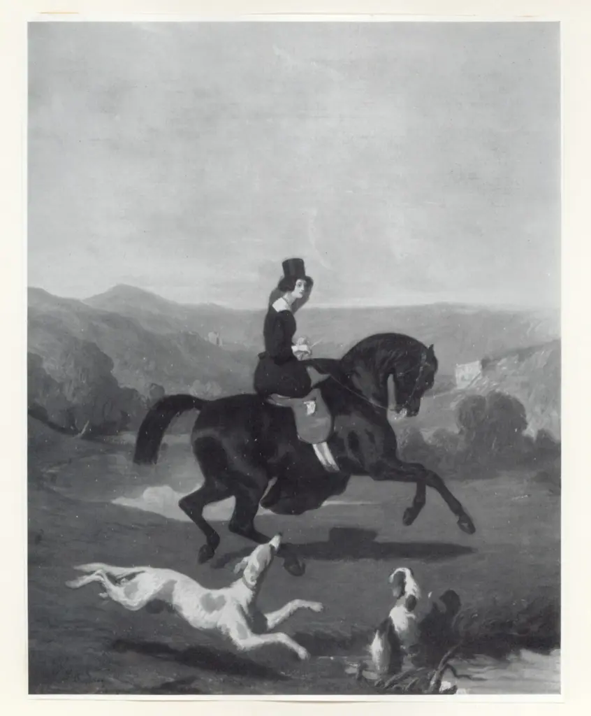 ![De Breux, Alfred , Amazone sur un Cheval noir, et deux Chiens]()