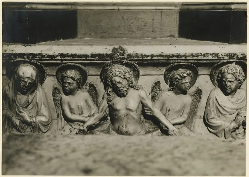 ![Pisano Nino , Cristo in pietà sorretto da angeli tra la Madonna addolorata e san Giovanni Evangelista dolente]()