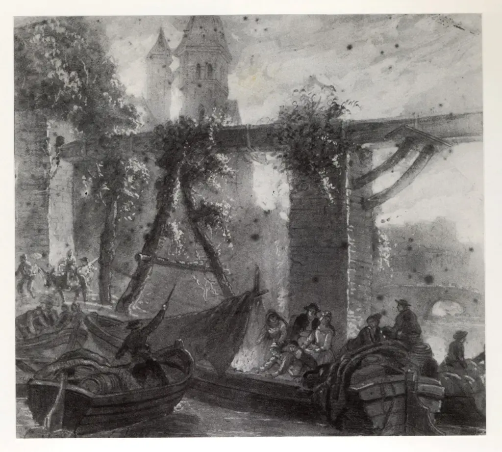 ![Isabey, Jean Baptiste , Barche all'ingresso di un castello, con figure intorno a un fuoco]()