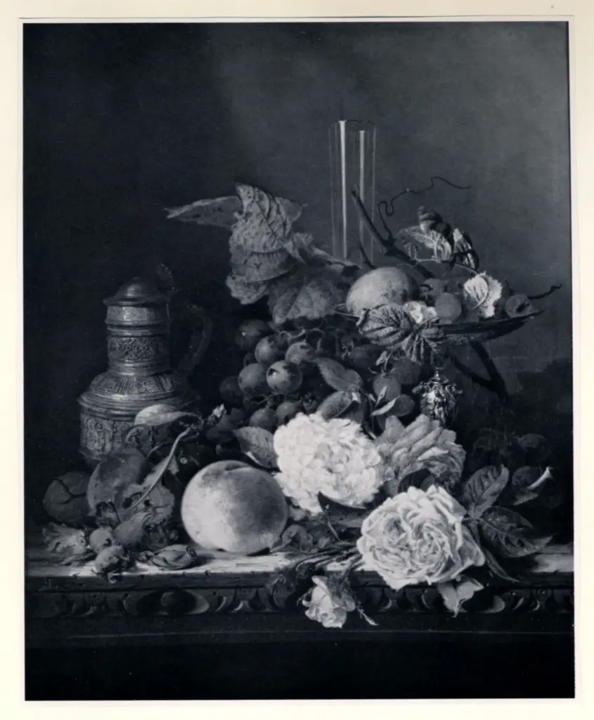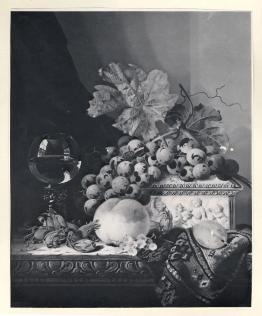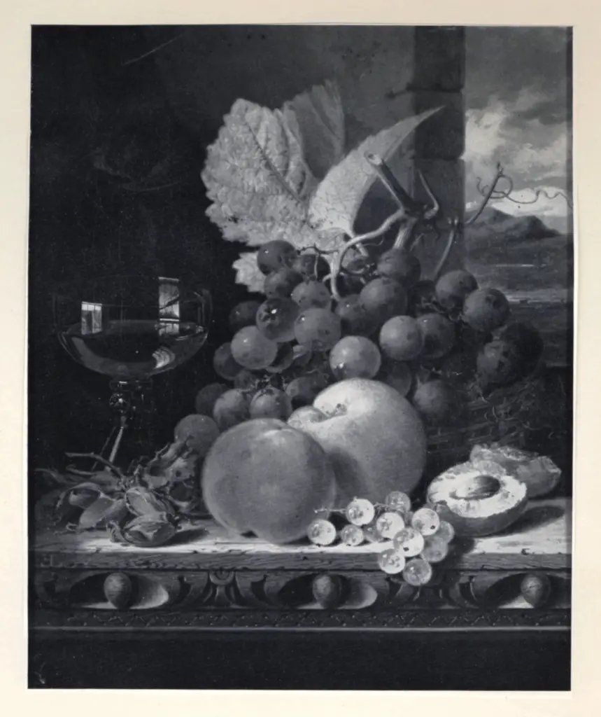 ![Ladell, Edward , A still life with peaches, grapes and a goblet of wine]()