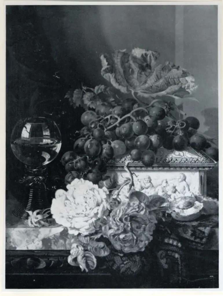 Grapes, roses, a wine glass and a carved ivory casket -