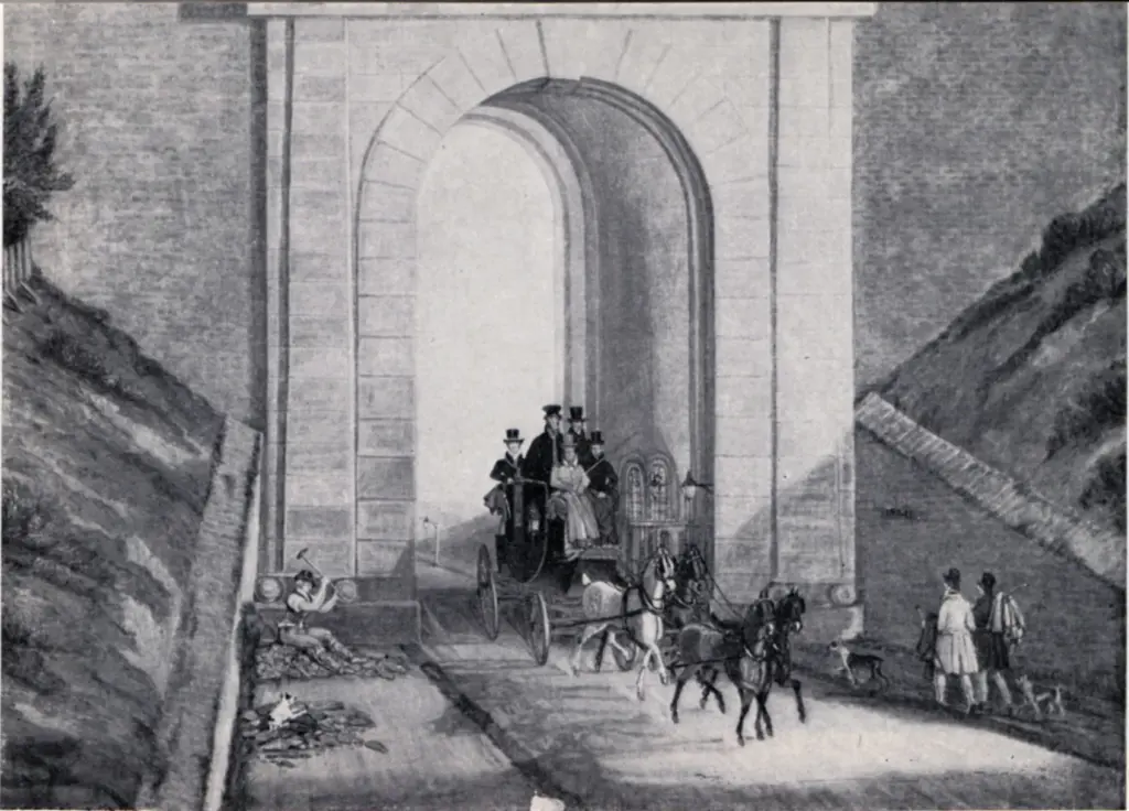 Highgate Tunnel, a mail coach entering London -