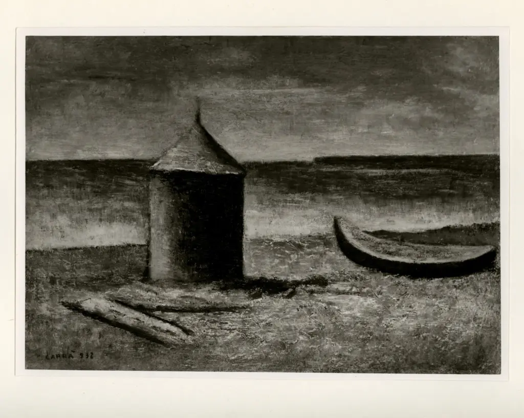 Carrà, Carlo , Marina con capanno e barca Carrà, Carlo