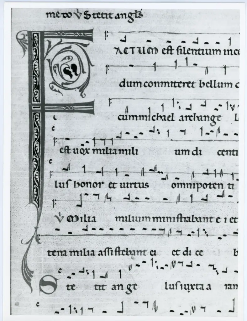 Iniziale F, Iniziale decorata, Motivi decorativi fitomorfi, Notazione musicale
